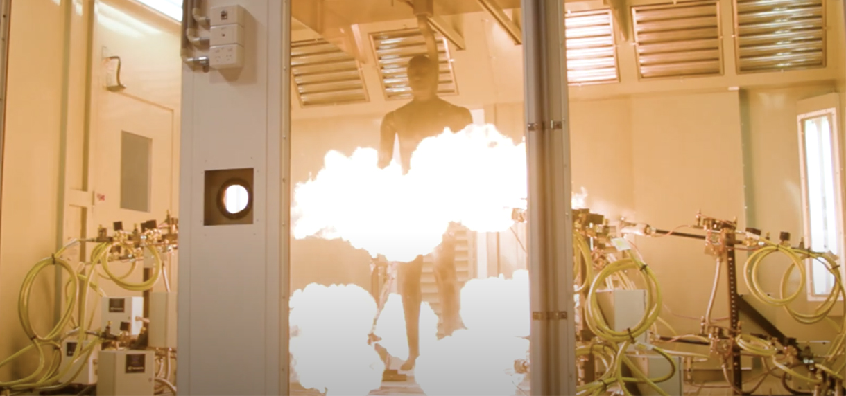 FLAMME uses a purpose-built Thermetrics burn injury manikin equipped with 134 temperature sensors distributed across its surface. When clothed, the manikin can withstand an 84 kW/mÇ flash-fire for 3-20 seconds.
