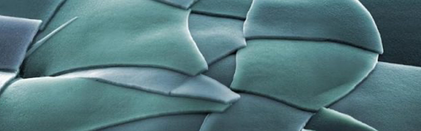 Image credit: Micro-Tectonic Plates. High temperature processed Indium tin oxide (ITO) transferred to Polydimethylsiloxane (PDMS) for creating flexible electronics. The ITO micro-tectonic plates can slide over one another to form a large area stretchable device while maintaining full functionality. Sample by Philipp Gutruf, PhD candidate in School of Electrical and Computer Engineering, RMIT University. Image by Linnea Rundgren, Linear Imaging. Image taken on FEI Nova NanoSEM (Scanning Electron Microscope) at the RMIT Microscopy & Microanalysis Facility (RMMF) at RMIT University.