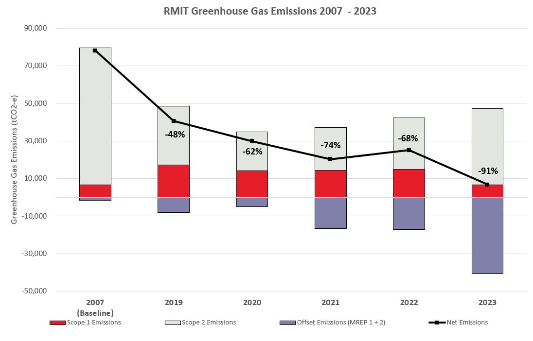RMIT achieved a 92% reduction in Scope 1 and 2 emissions in 2024, based on a 2007 baseline, showing a slight decrease from 2023 totals. This significant reduction is mainly due to reduced gas usage following the shutdown of on-site gas engines in late 2022. From 1 January 2023, all onshore grid electricity was sourced from renewable energy. The Melbourne Renewable Energy Projects 1 & 2 supplied 50,107MWh of renewable electricity to RMIT in 2024. Under the Australian operational emissions profile, RMIT accounts for all energy and emissions within the building portfolio, using emissions factors in accordance with the National Greenhouse and Energy Reporting Act 2007.