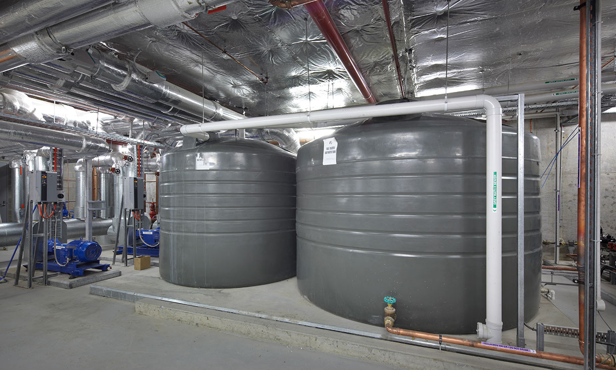 We have 1.3 million litres of on-site water storage capacity including integrated and freestanding collection tanks, reducing potable water demand by capturing rainwater and stormwater for toilet flushing and irrigation.