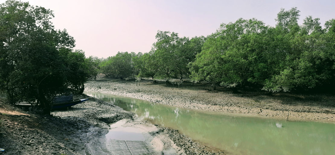 Mangrove forests and swampy terrain just flanked by a man-made dam/embankment which is behind the photographer. Due to the impact of the dam and the daily tidal shifts, the flow of water to this side is restricted