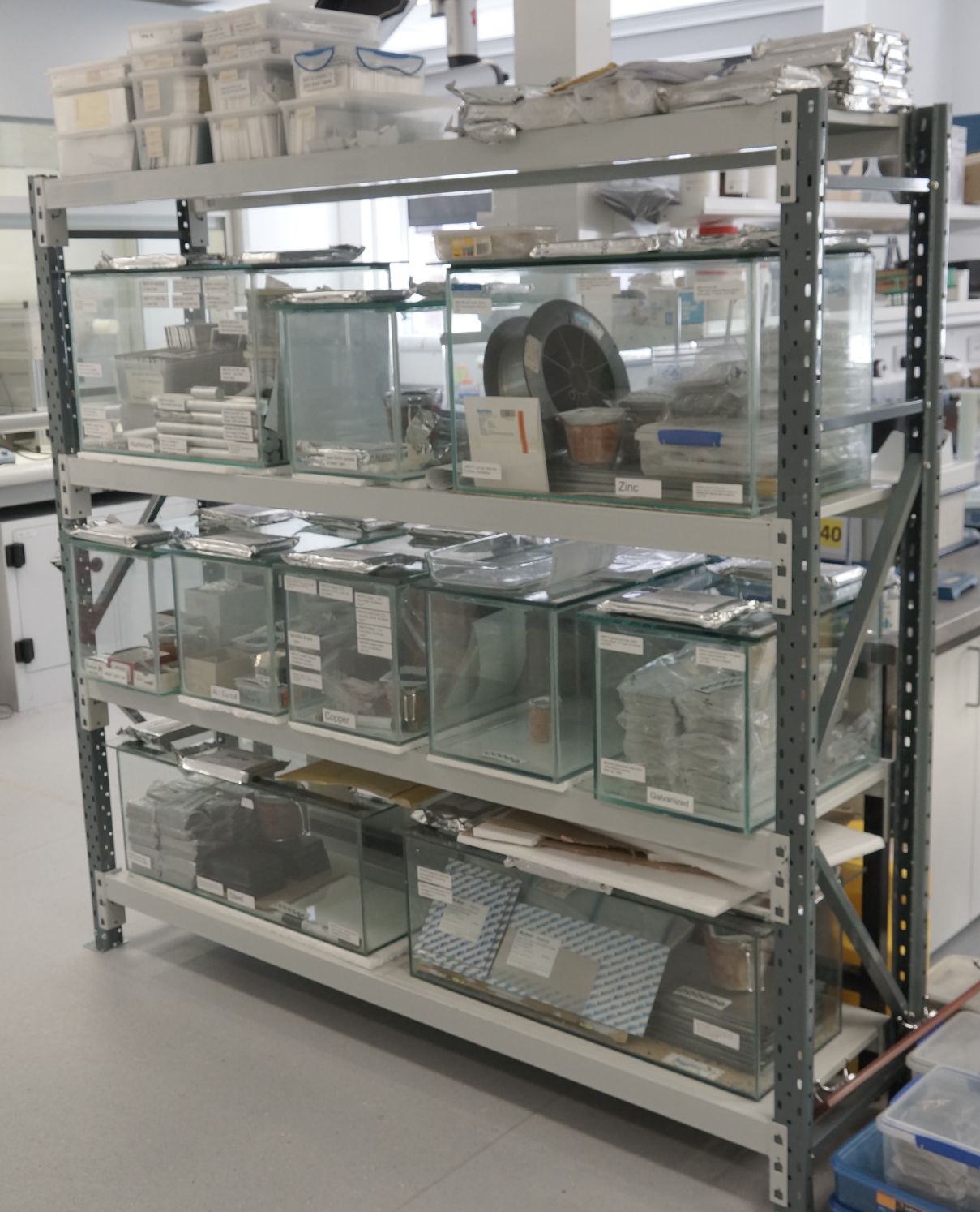 Numerous metal samples used for electrochemical testing & coatings applications, including a wide range of aluminium alloys, steels, galvanized steels, zinc, copper, and others.