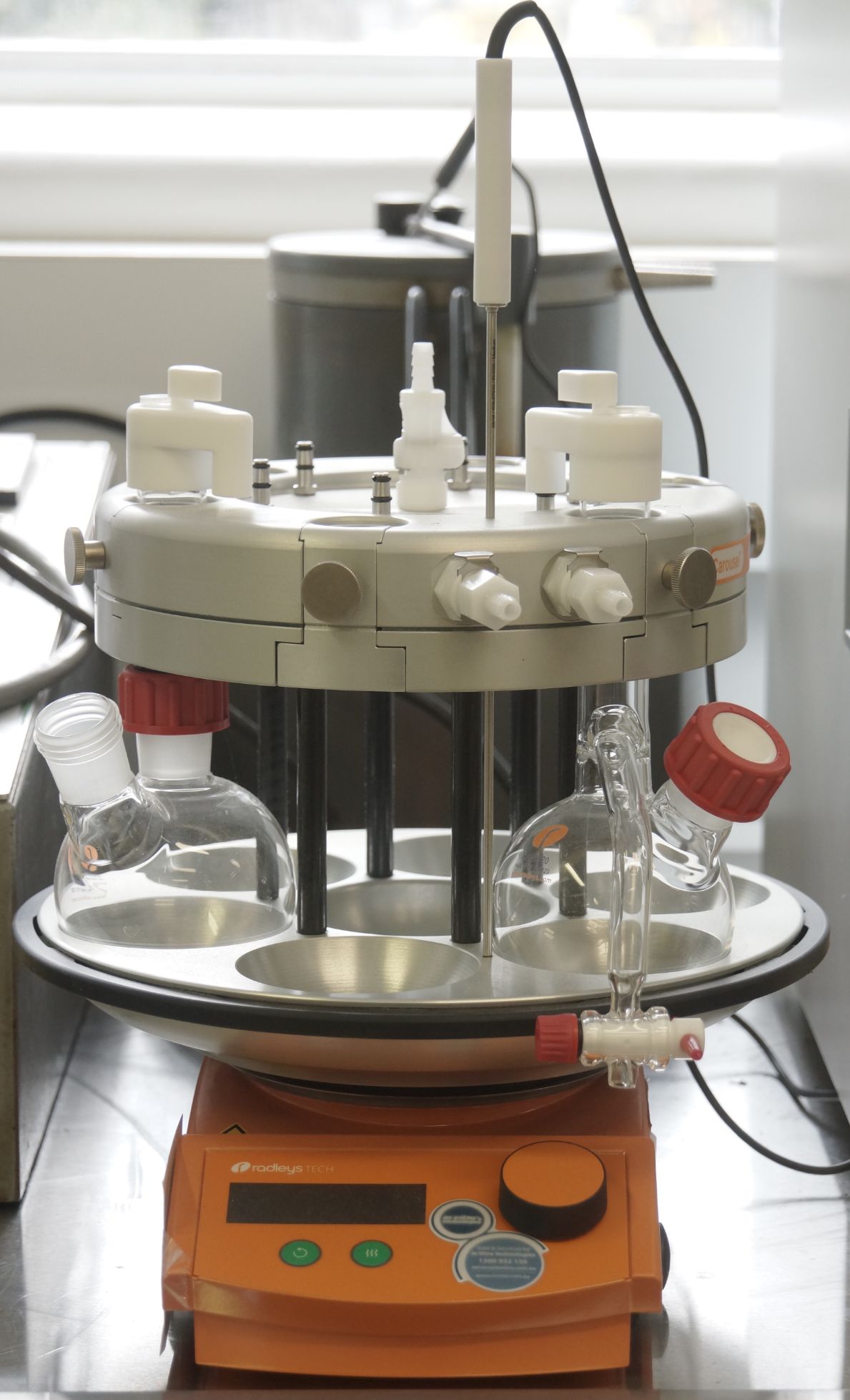 Simultaneously heats, stirs, and refluxes multiple samples to perform chemical reactions under an inert atmosphere.