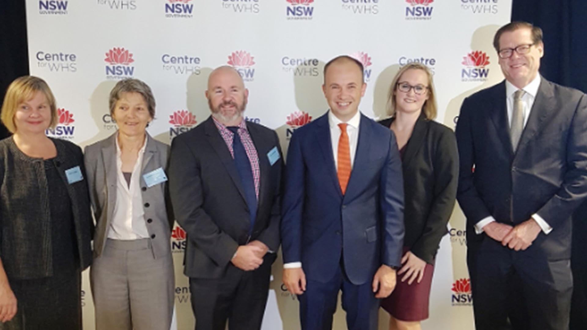 Pictured from left to right: Dist. Professor Helen Lingard (RMIT University), Professor Lyndall Strazdins (Australian National University), David Solomon (Master Builders Association), The Hon. Matt Kean MP, Skye Buatava (Centre for Work Health and Safety) and Peter Dunphy (SafeWork NSW).