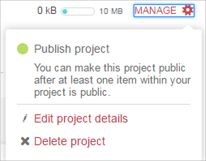 Click Manage and select Publish project. Please note, your project needs to include at least one public item before you can publish it.