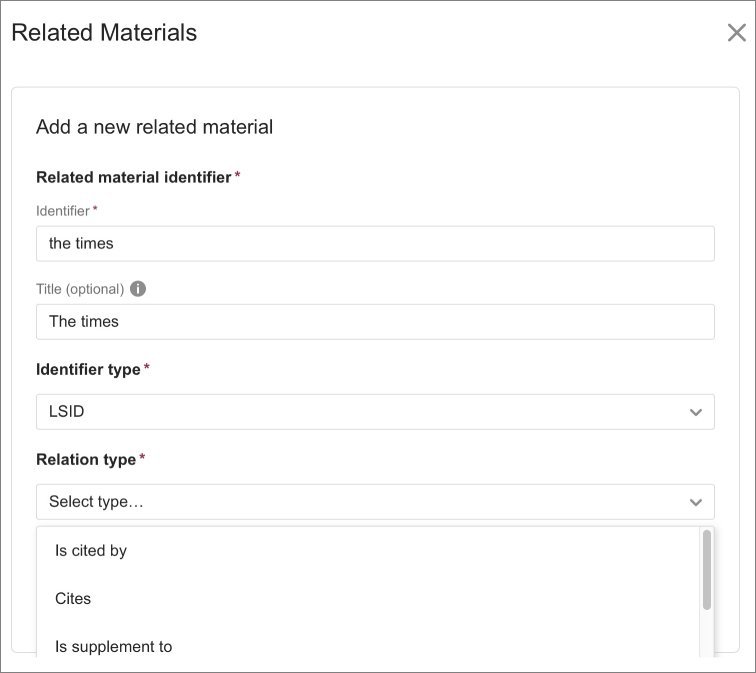 12. Add links to other research objects using Related Materials and provide information on the relation types.