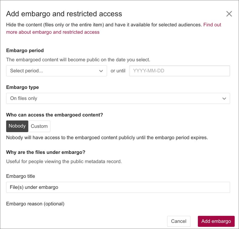 2. A form will open and you can upload files and fill in metadata as described below.