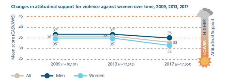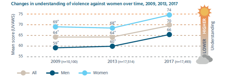The NCAS survey shows there has been an increase in the understanding of violence against women, moving from an average score of 64 to 70, and improvement in support for gender equality moving from an average score of 64 to 66.