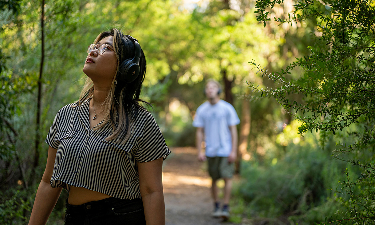 Someone wearing headphones wanders through natural bushland. A blurred figure wearing headphones is in the background also. All players need is a pair of headphones and a smartphone to enjoy the augmented reality experience. Source: Kit Edwards