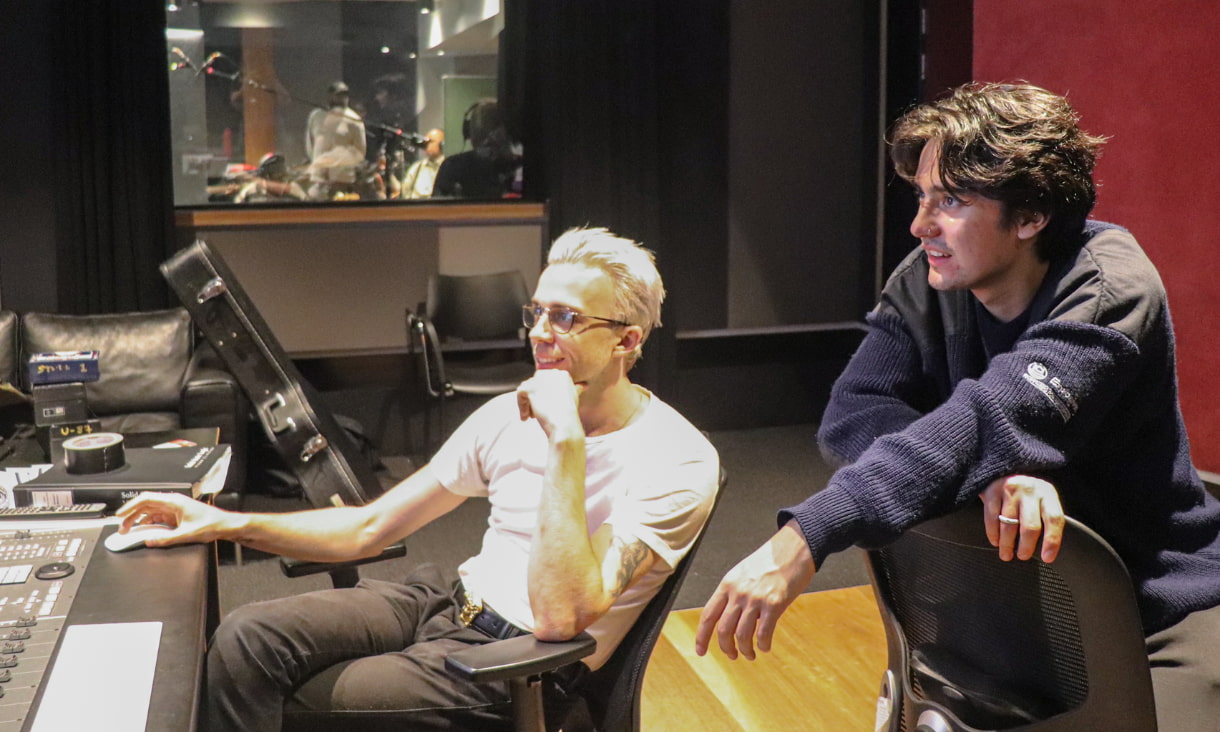 2 men sit a recording studio desk James Finlayson-Smith and Callum Tham working in the studio