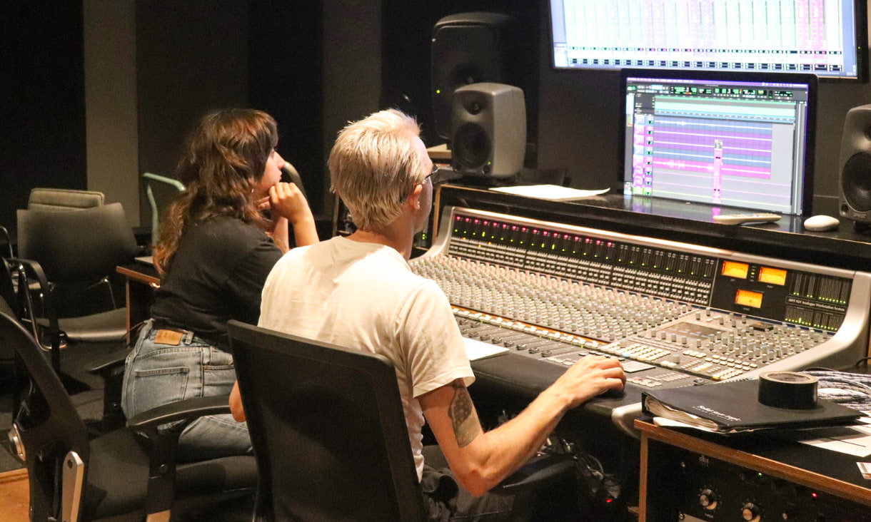 A man and a woman sit at a recording studio desk Sarah Occino and James Finlayson-Smith gained valuable hands-on experience in the studio