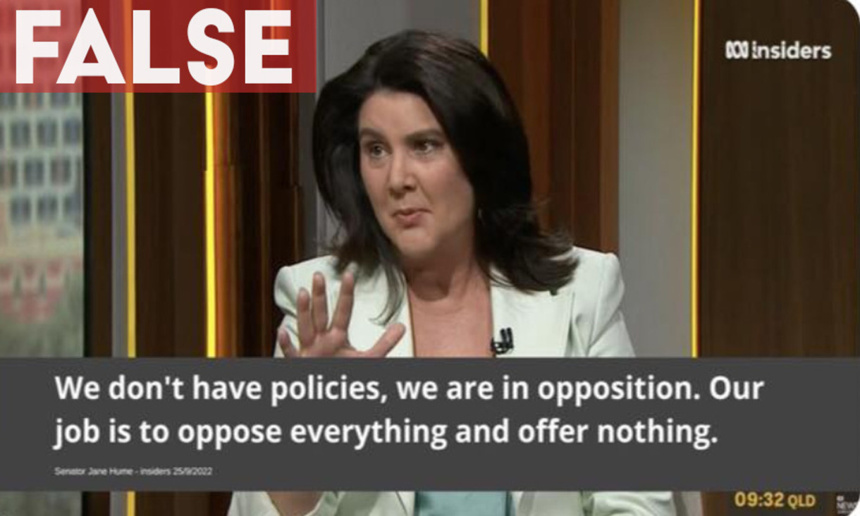 A photo of Shadow Finance Minister Jane Hume has been captioned to falsely quote her as telling the ABC’s Insiders program that the Opposition’s job was to “oppose everything and offer nothing”.