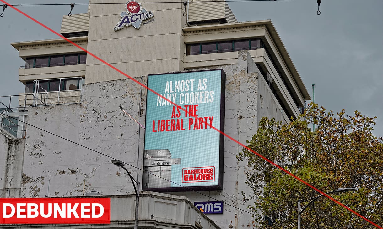 The verdictFalse. Photos that appear to show electronic billboards featuring a Barbecues Galore ad campaign with the slogan "almost as many cookers as the Liberal Party" were photoshopped. They are not genuine adverts. The social media user who uploaded the images admitted he had created them.