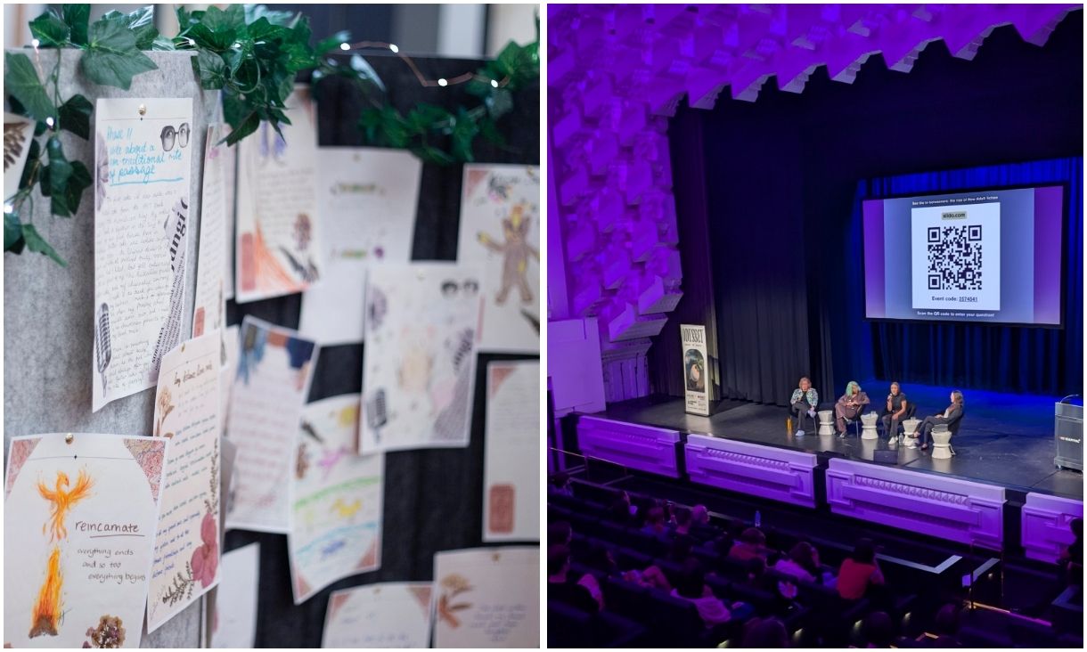 Left image shows close up photography of letters written pinned to a display board and right image shows students at Capitol Theatre watching a small panel group of stage present during the Odyssey festival. The Odyssey Literary Festival, a celebration of storytelling and creativity held at RMIT’s Capitol Theatre.