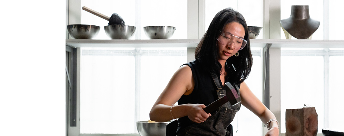 VISUAL: Interior Design Student, Maddy Davidson stands in front of an art-covered wall. She talks to an off-screen interviewer.