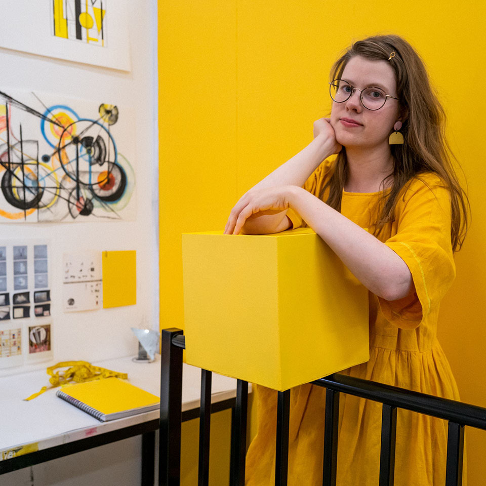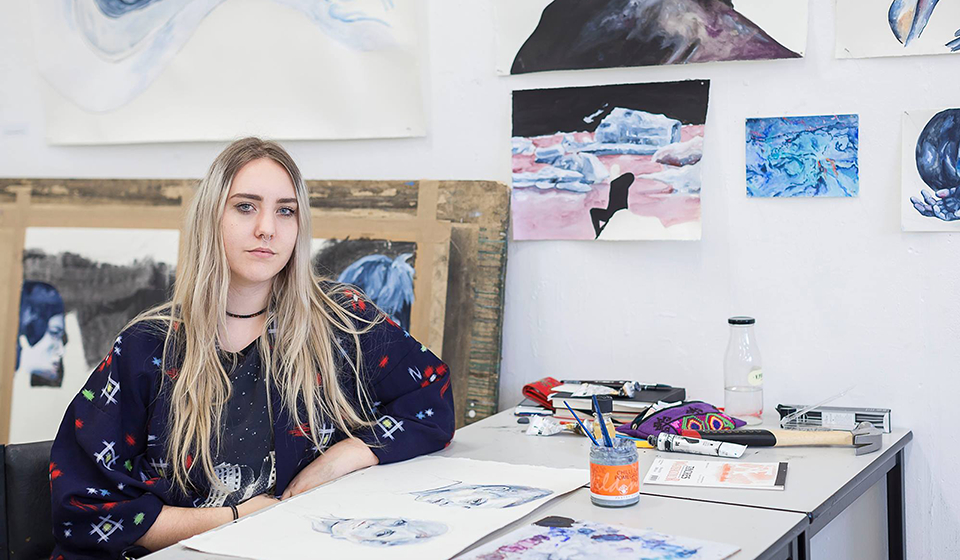 VISUAL: Interior Design Student, Maddy Davidson stands in front of an art-covered wall. She talks to an off-screen interviewer.